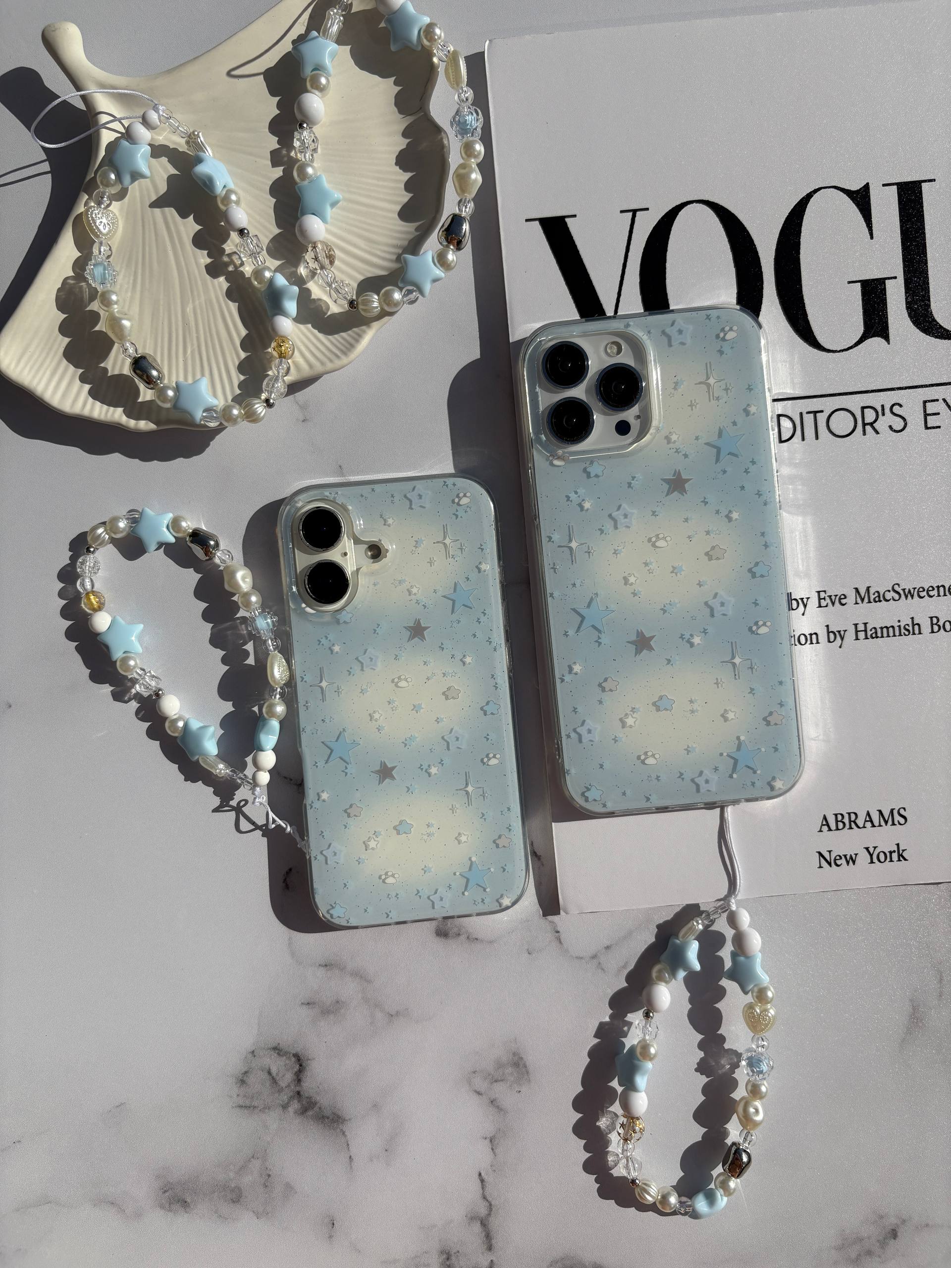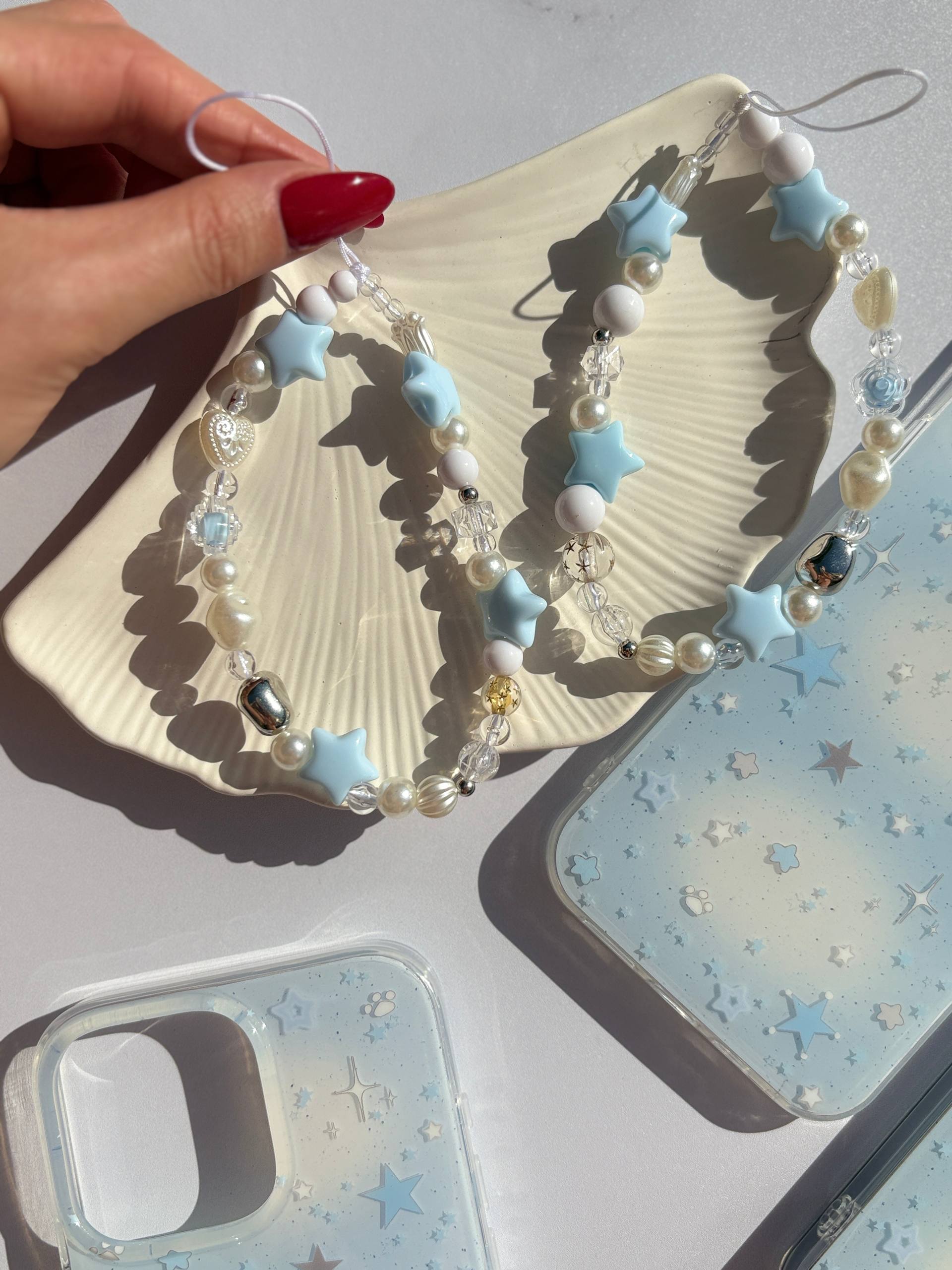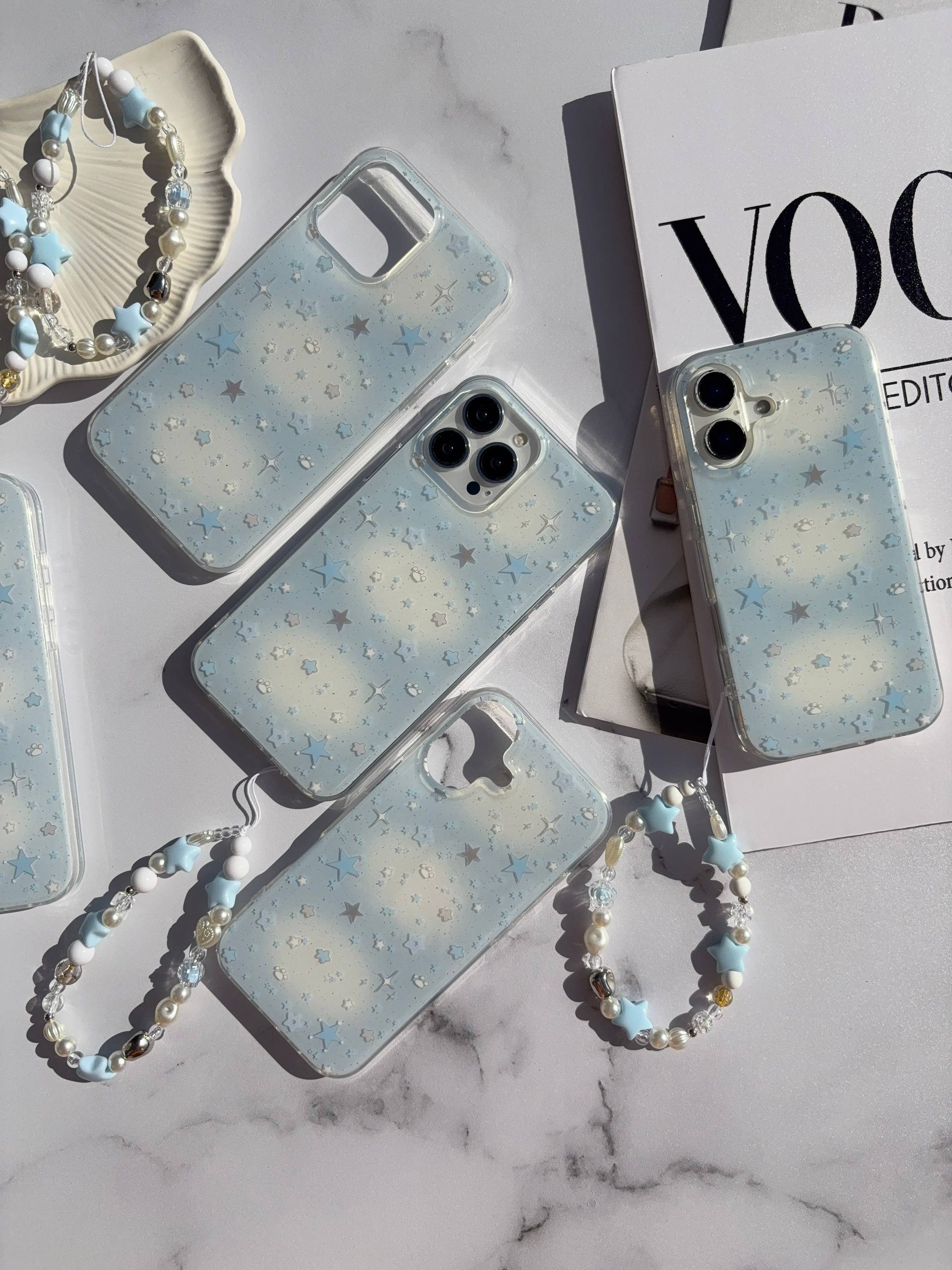 المانهای کوچک براق. جنس: به نظر میرسد از جنس پلاستیک شفاف (TPU یا سیلیکونی) با روکش چاپی باشد. استایل: فانتزی، دخترانه و ظریف با تم ستارهای و آسمانی. اکسسوری: به همراه بندهای دستبندی تزئینی از مهرههای مرواریدی، مهرههای آبی ستارهای و کریستالی که به قاب وصل میشوند